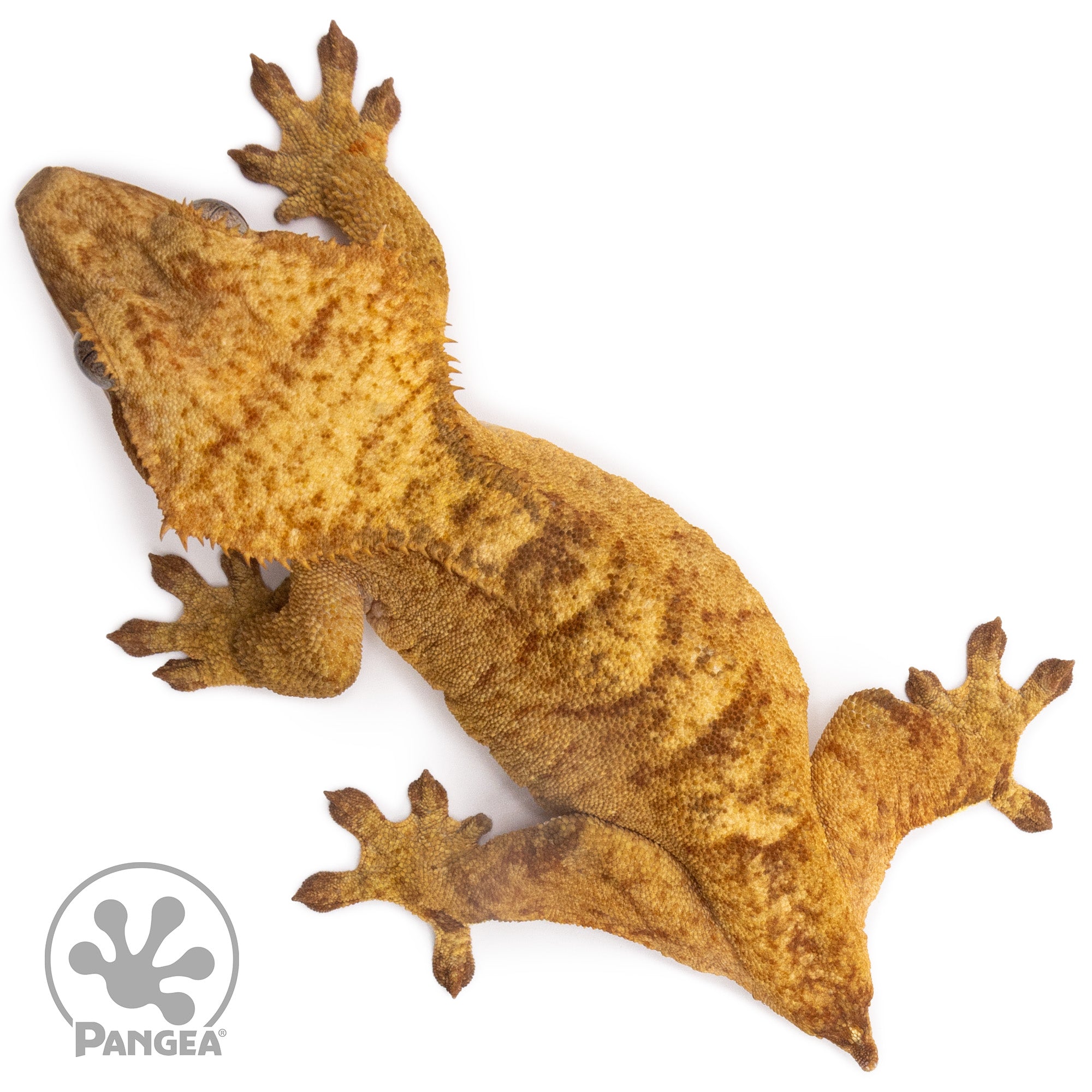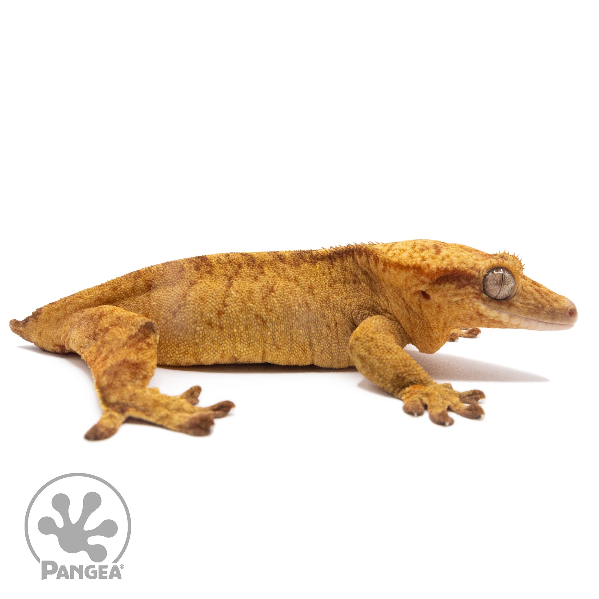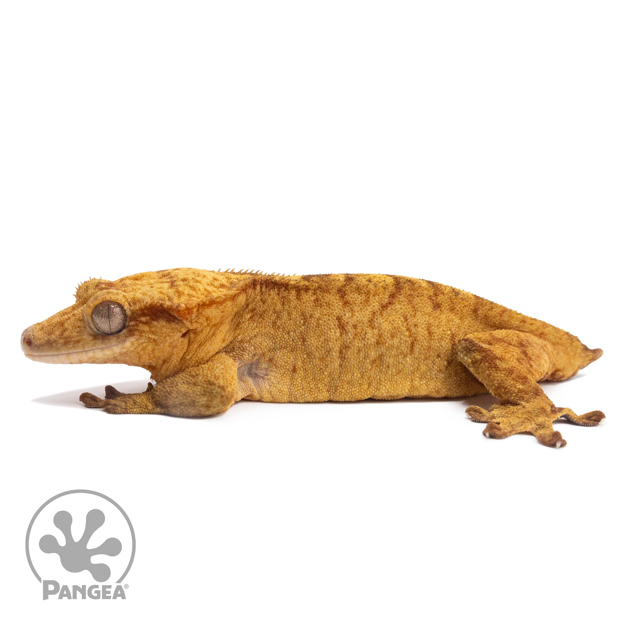 This Female Brindle Crested Gecko Cr-2826 showcases a vivid orange pattern on a rich red base, displaying her distinctive brindling. Ready to breed, she is an excellent choice for breeders seeking vibrant colors and unique patterning.