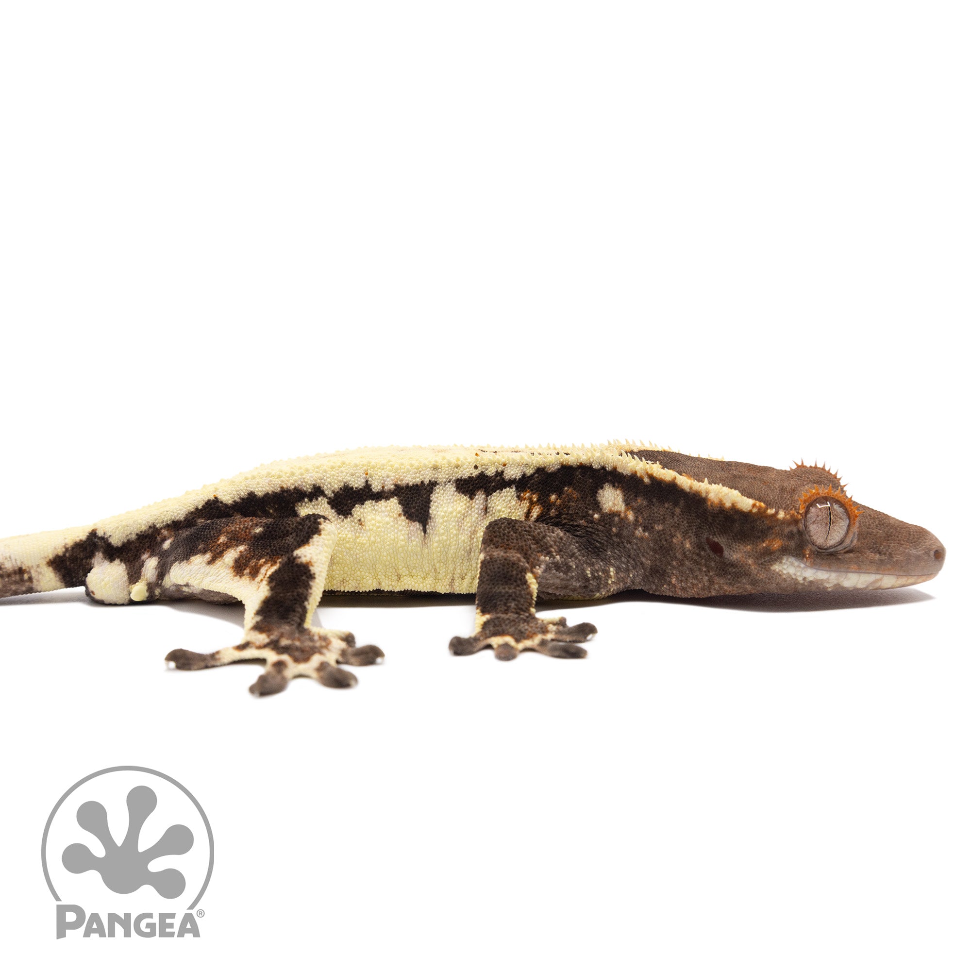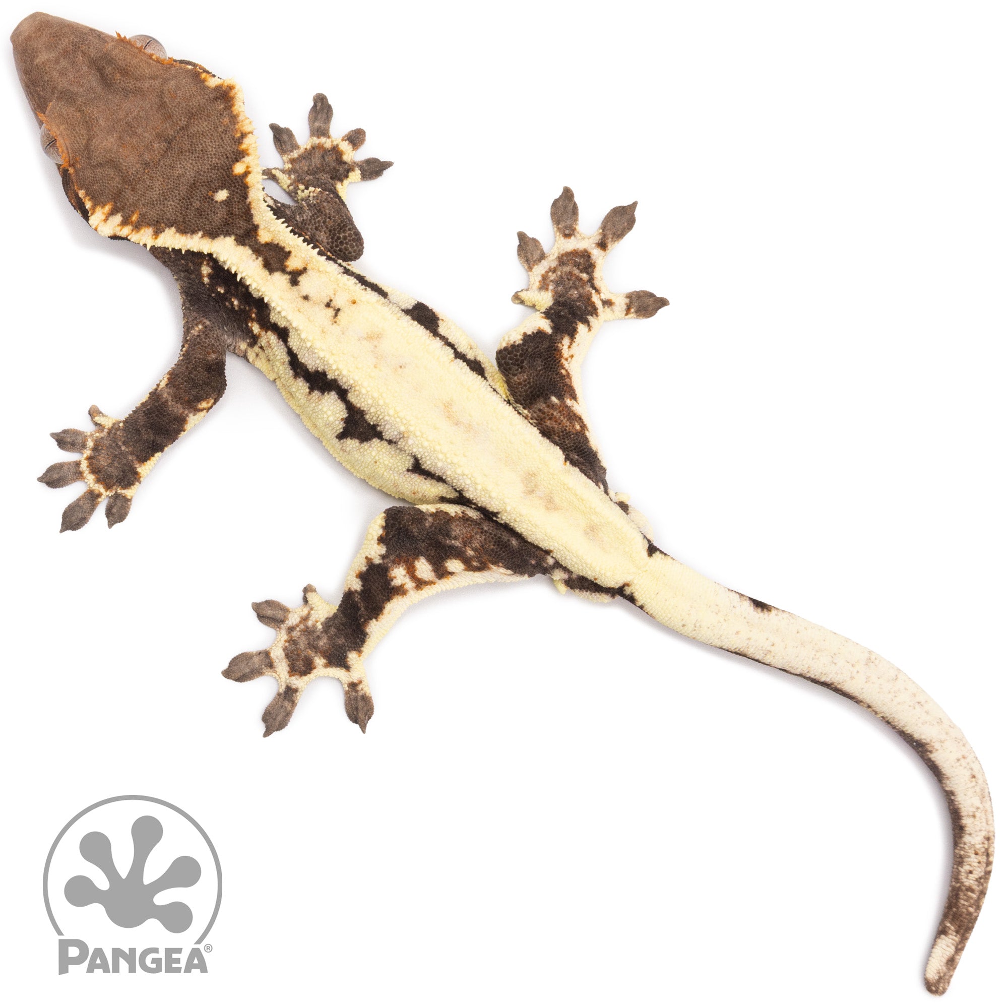 Meet the Male Frappuccino Crested Gecko Cr-2802, showcasing a striking, extreme harlequin pattern in a crisp white set against a dark base, with distinctive snowflake markings. prized for its bold contrast and unique pattern, he is perfect for collectors looking for a visually impressive crested gecko.