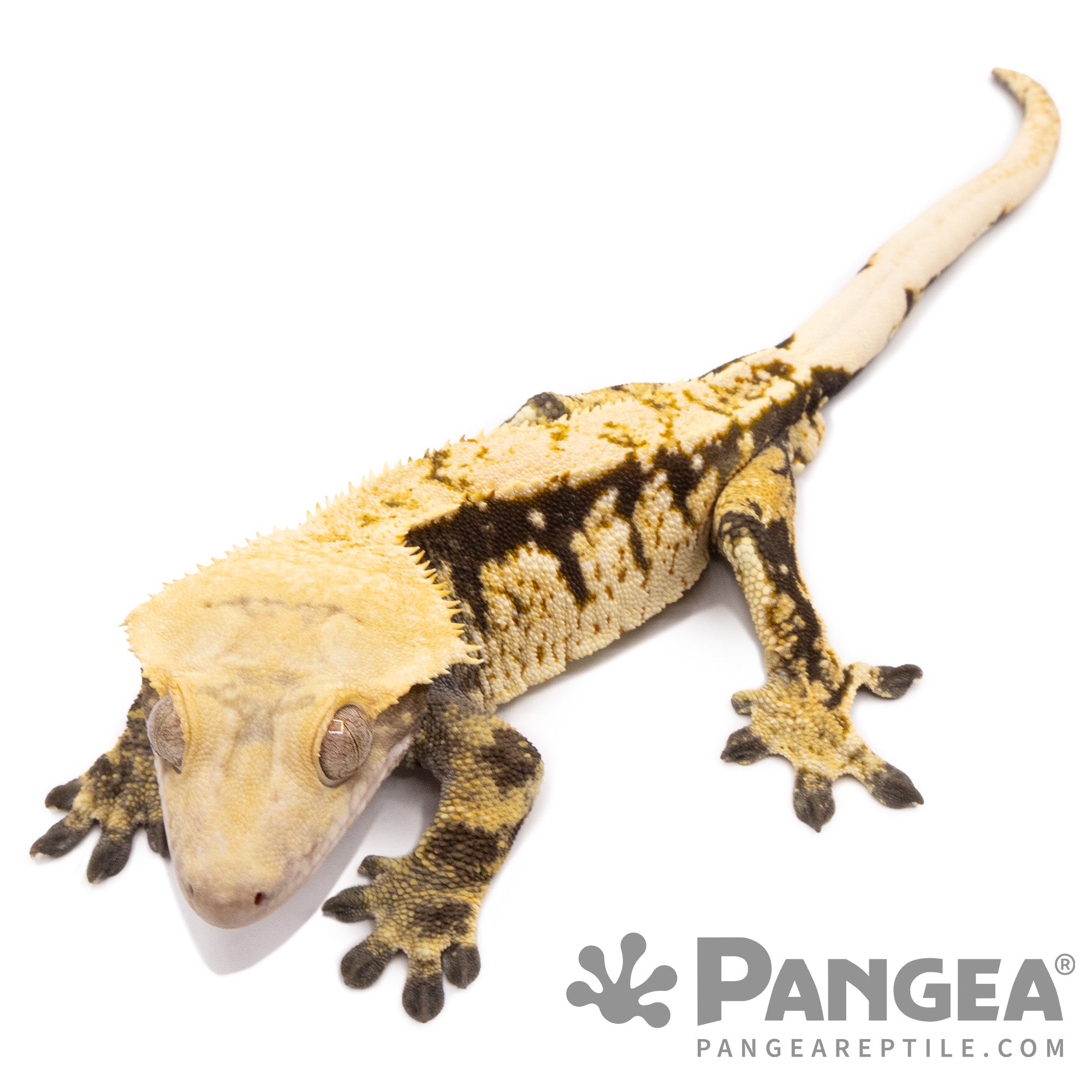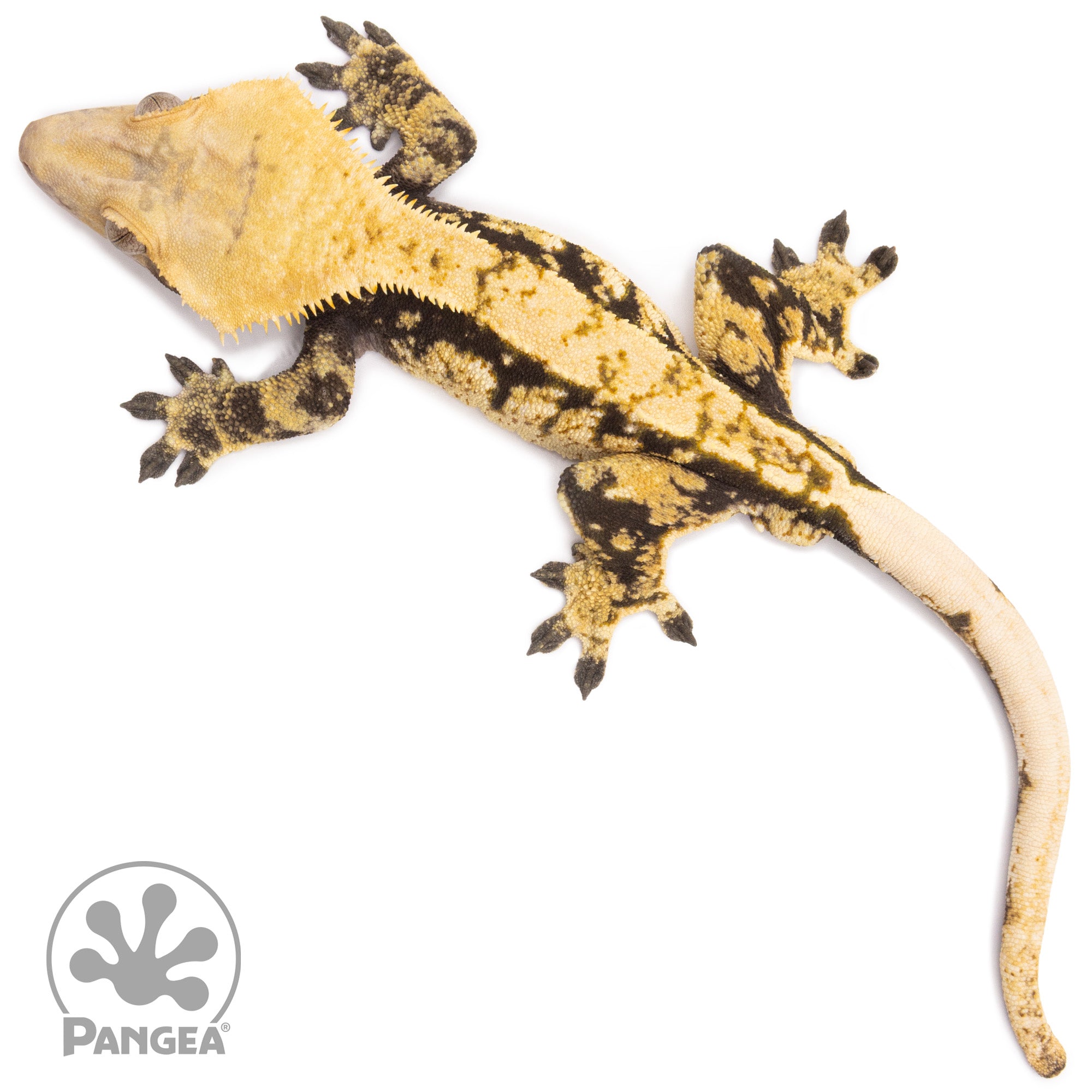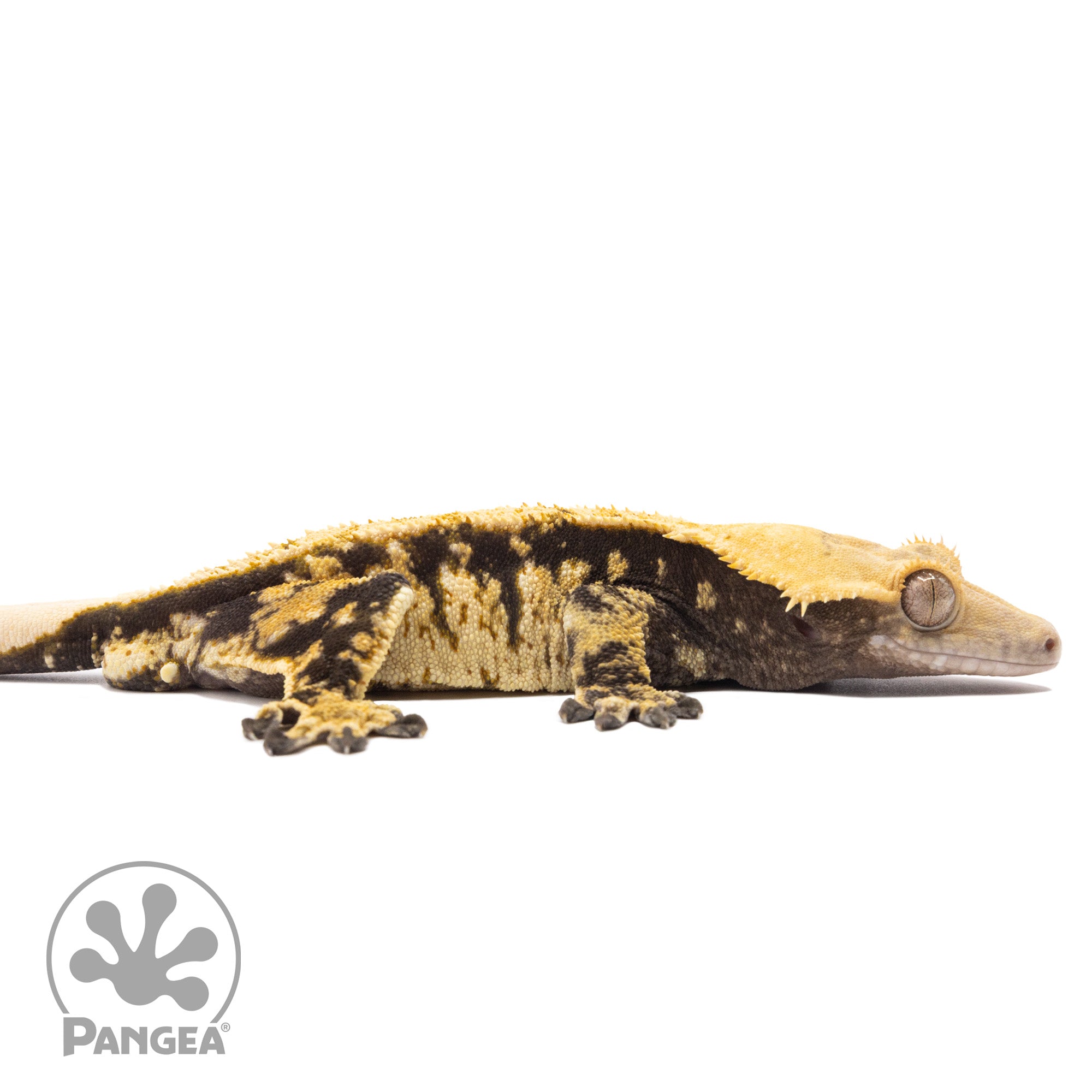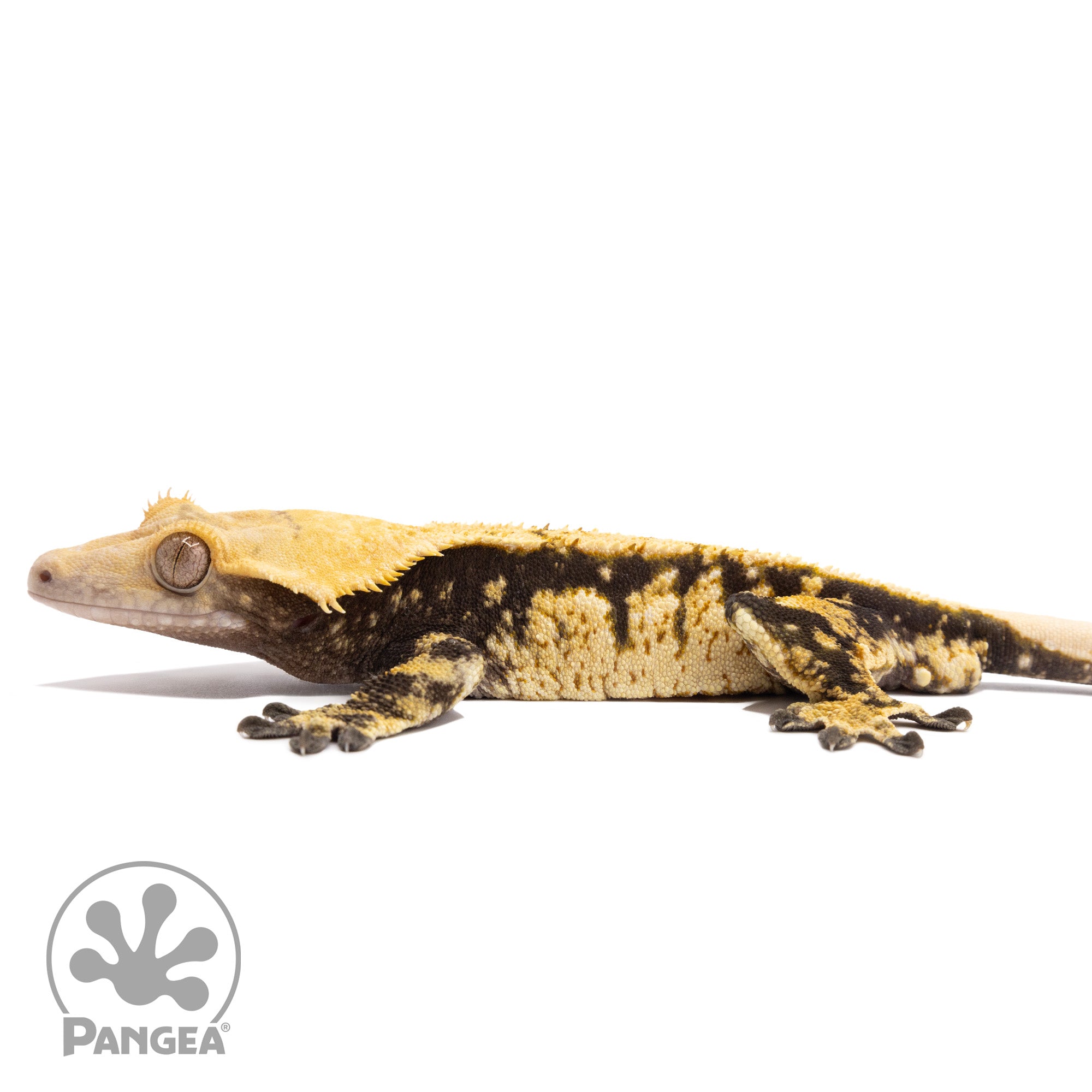 This male Het Pixel Crested Gecko Cr-10006 features an extreme harlequin pattern in vibrant yellow and creamy set atop a dark base. Ready to breed, this tangerine gecko combines striking colors and patterns, making him an excellent choice for enhancing your collection!