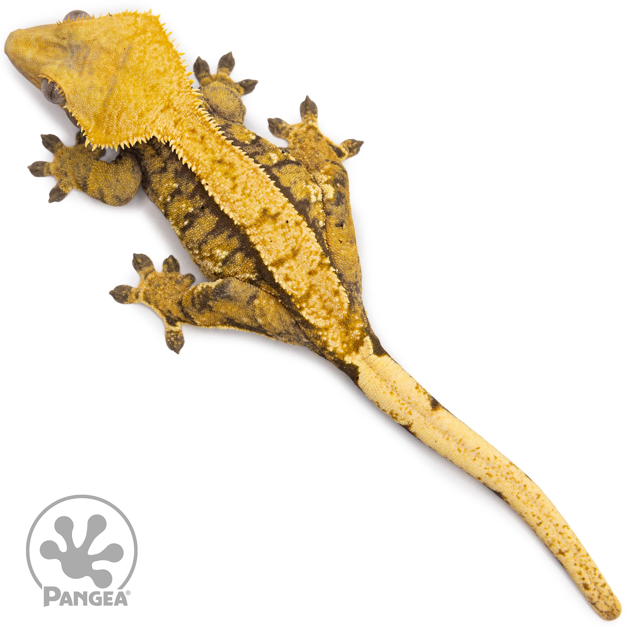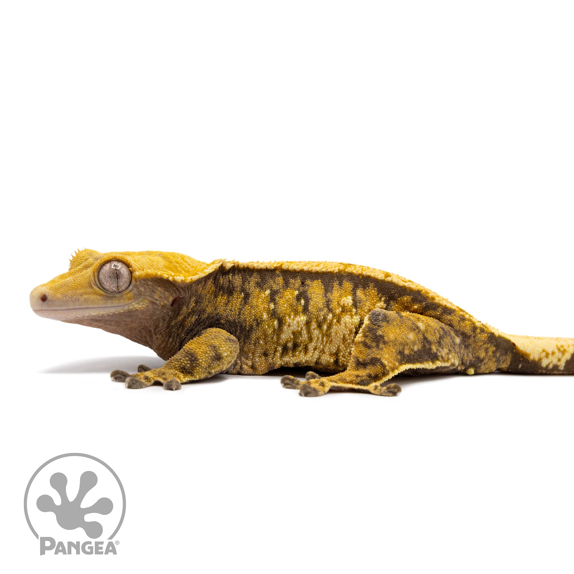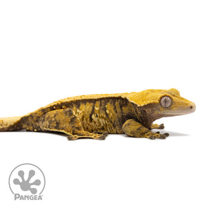 Introducing the Female Tricolor Extreme Harlequin Crested Gecko Cr-2424 featuring a striking extreme tricolor pattern in a stunning yellow and cream set upon a dark base. with her partial pinstriping and ability to breed, she is sure to be a showstopper in any collection.