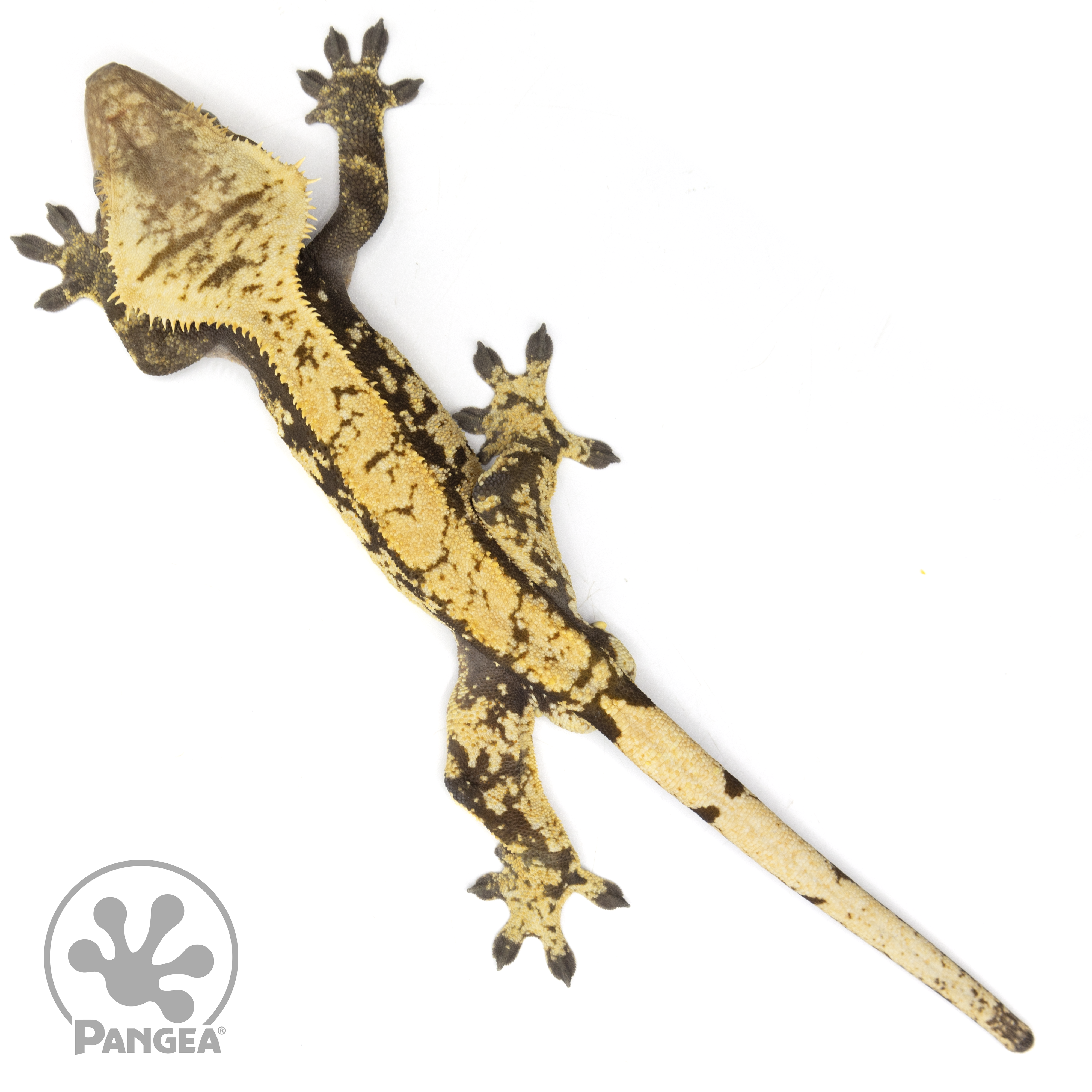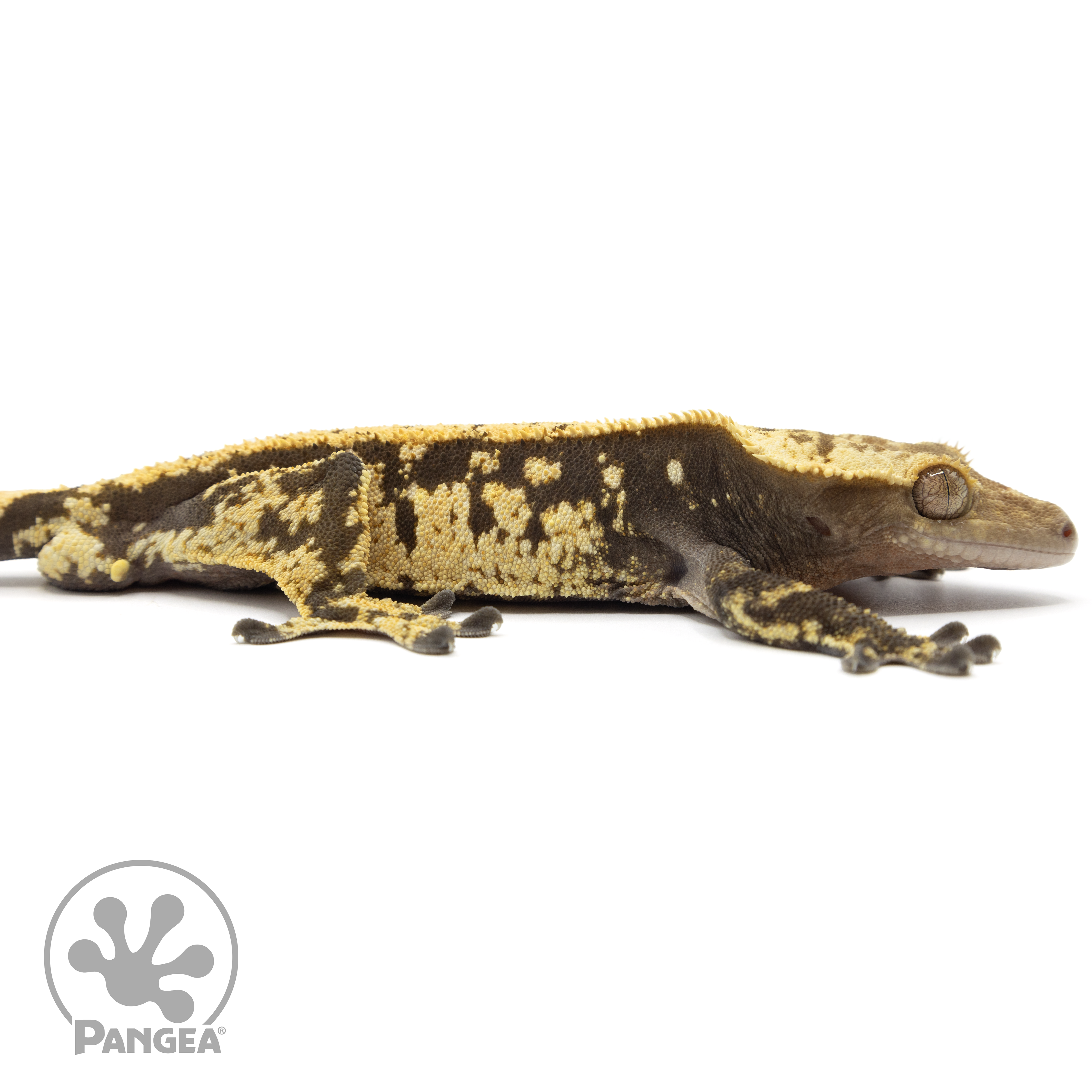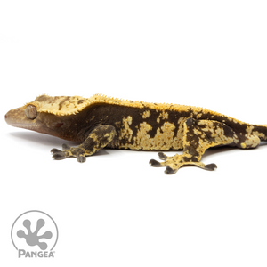 This Male Extreme Harlequin Crested Gecko (Cr-1733) features a stunning extreme yellow pattern on a dark base. He's ready to breed, making him an impressive eye-catching addition to any collection.