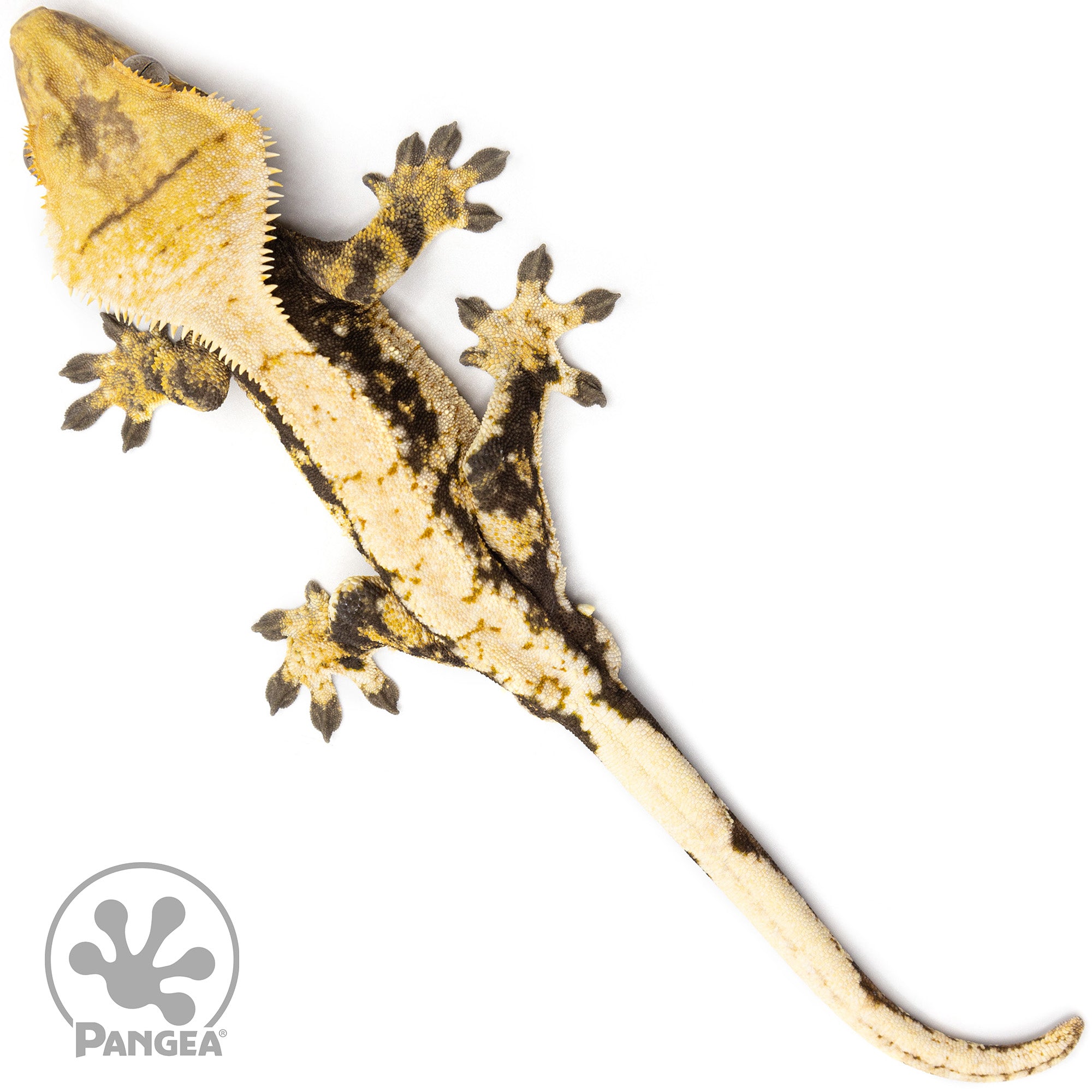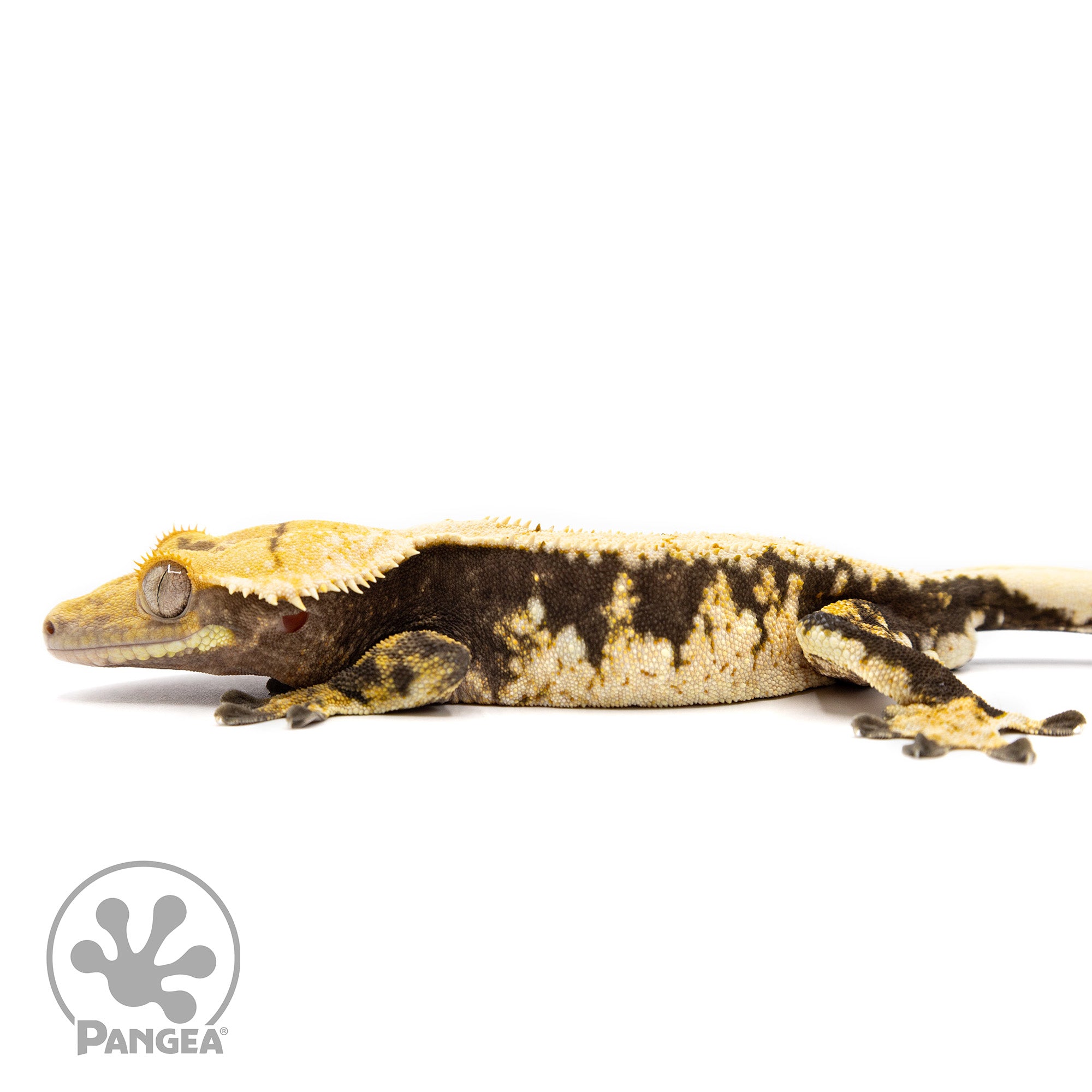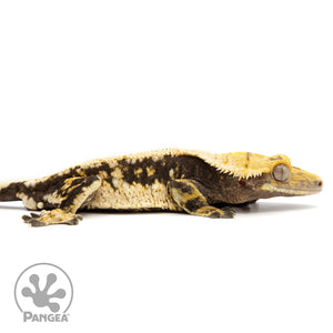 This Male Harlequin Tricolor Crested Gecko Cr-2458 boasts a harlequin pattern, complemented by a tricolor mix of yellow and cream on a dark base. Showcasing large crests and the ability to breed, this gecko's stunning features make him a standout in any collection.