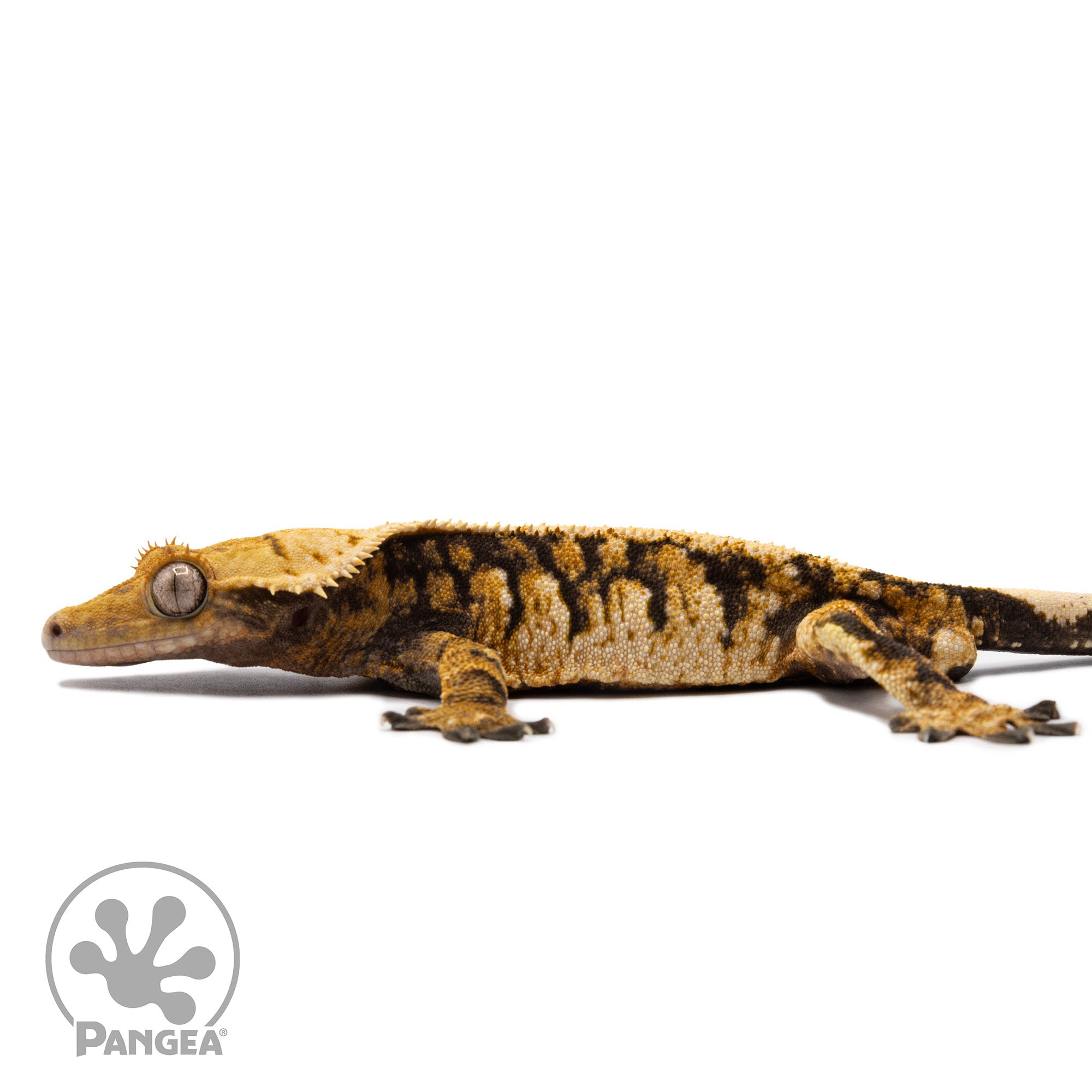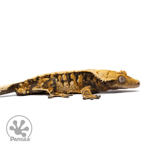 This Male Tricolor XXX Crested Gecko Cr-2757 boasts an extreme XXX pattern in vibrant orange and cream markings on a deep dark base. Ready to breed, he will make a stunning addition to any reptile collection!