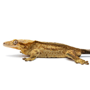 This male Reverse Quadstripe Crested Gecko stands out with its unique Reverse Pinstripe and Quadstripe patterns. Its vibrant orange and yellow colors make it a stunning addition to any collection. With large crests and ready to breed, this gecko is perfect for breeders and enthusiasts alike.