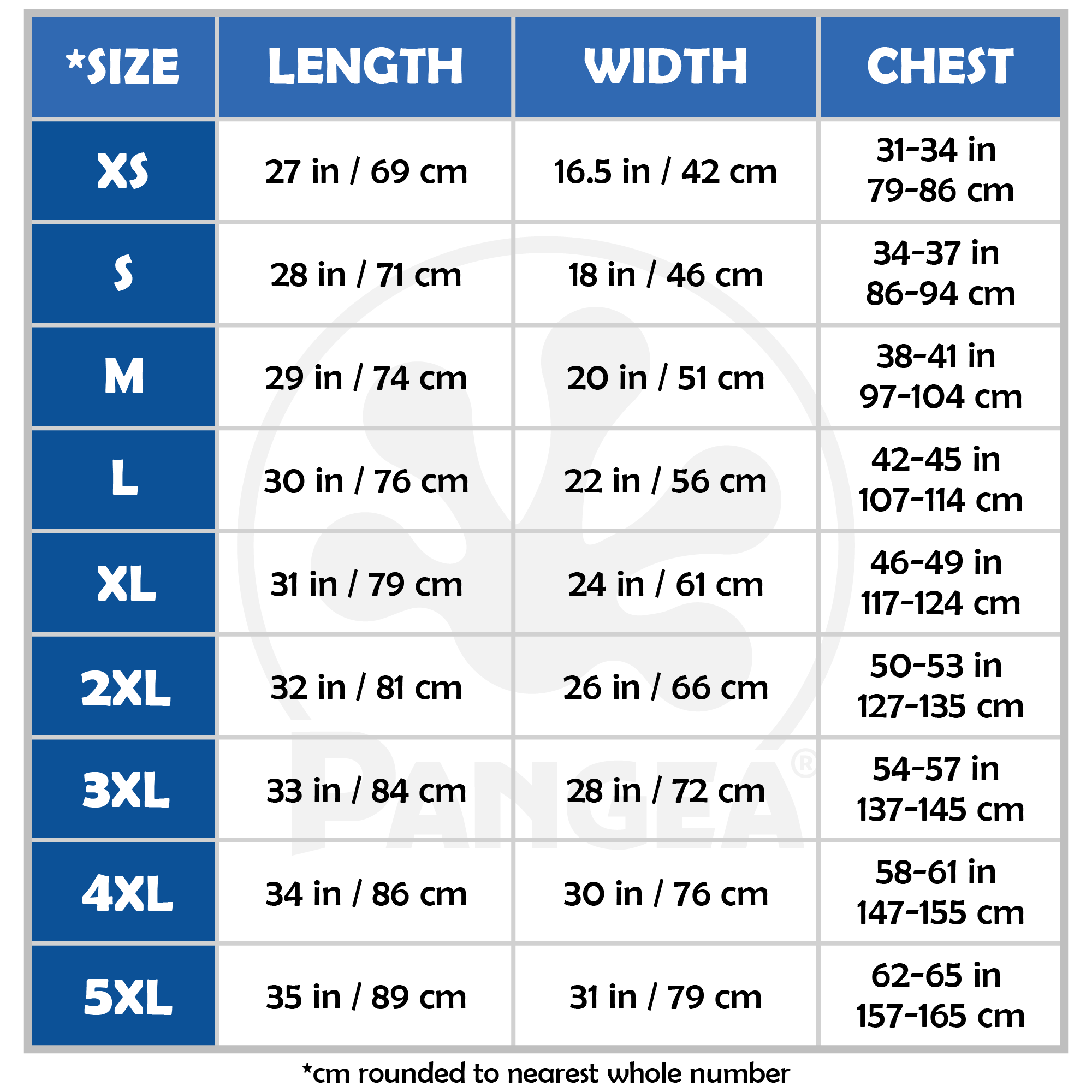 | LENGTH (inches) | WIDTH (inches) | CHEST (inches) | |