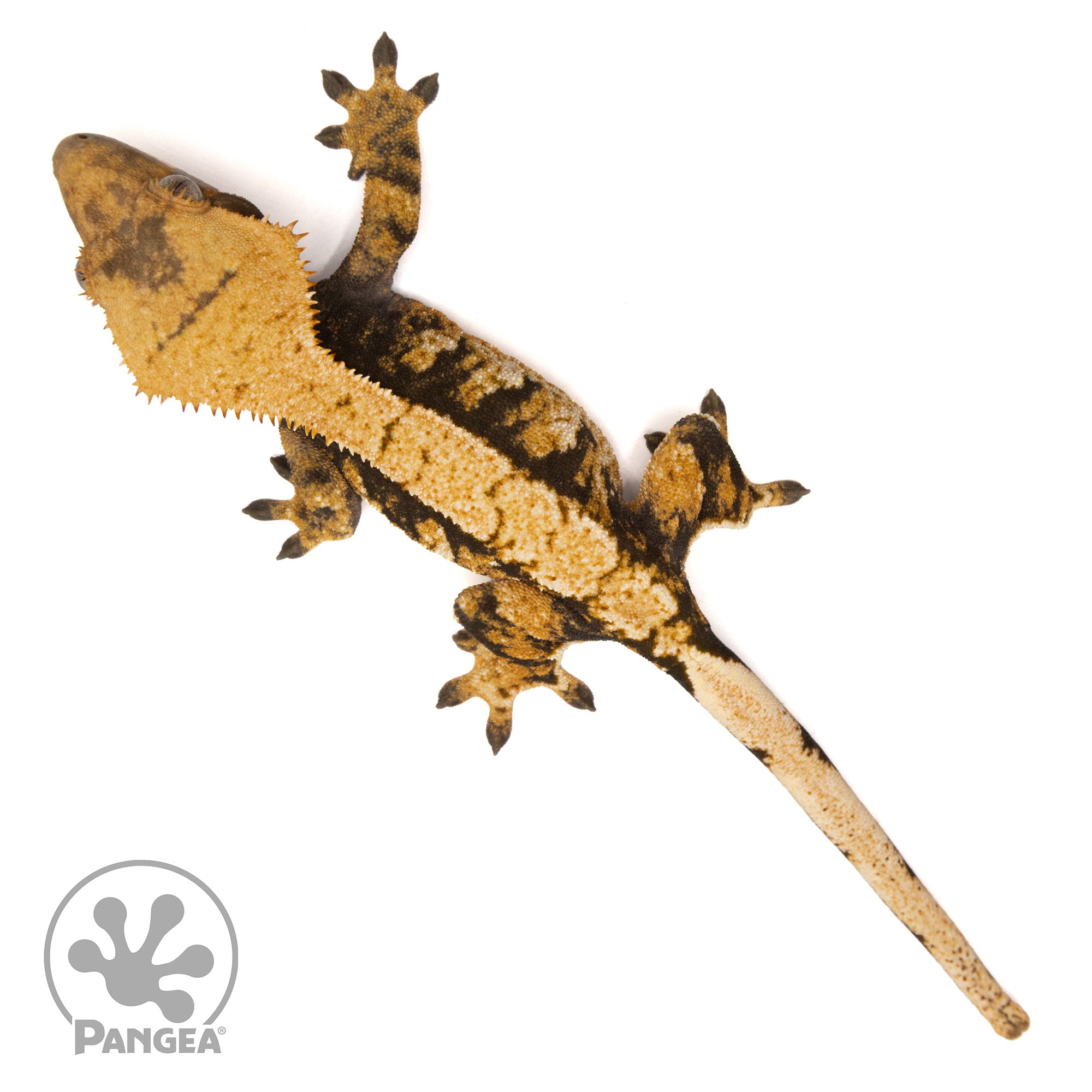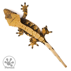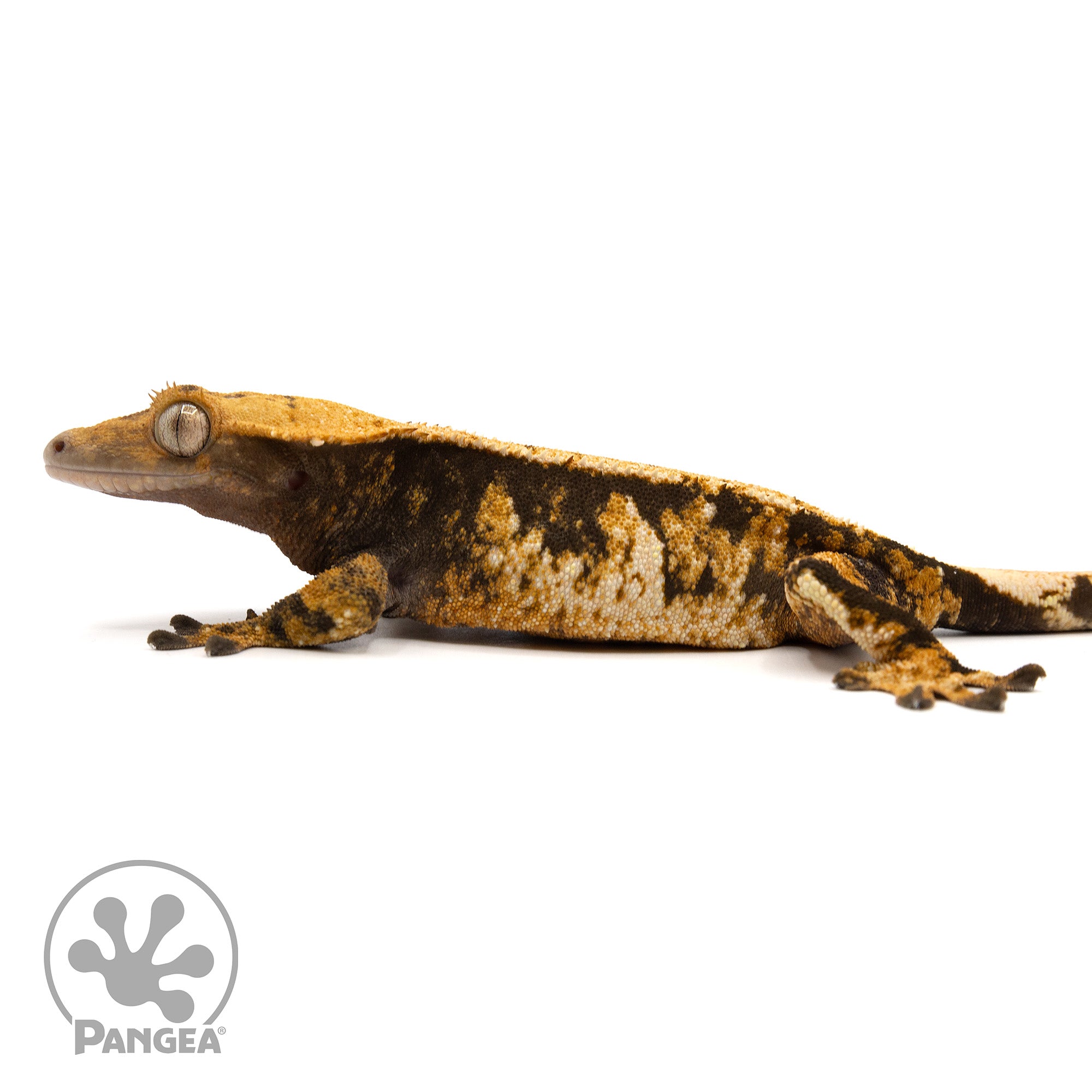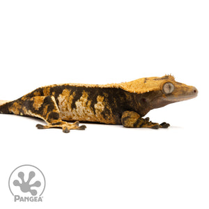 The Female Extreme Tricolor Crested Gecko Cr-2432 features a bold tricoloration of orange and cream extreme harlequin pattern on a dark base. She is ready to breed, perfect for any gecko enthusiast or breeder.