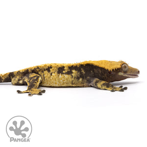 The Male Extreme Harlequin Crested Gecko Cr-2042 boasts a stunning combination of yellow and cream patterns on a dark base, giving him a striking appearance. With his snowflake pattern and ability to breed, this gecko is perfect for any breeder or collector.