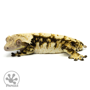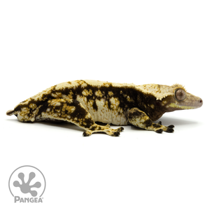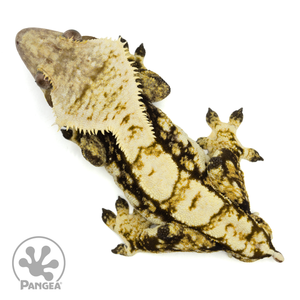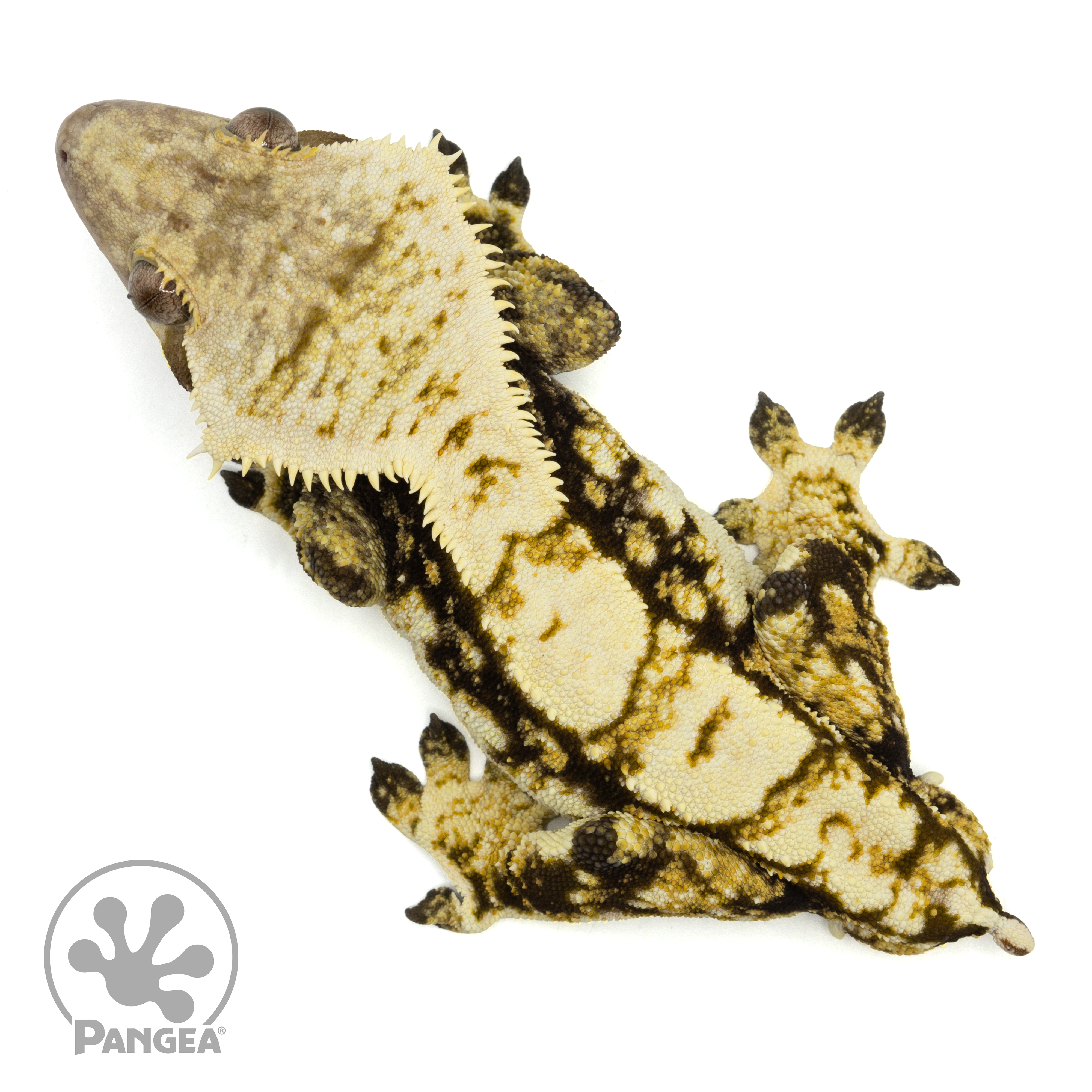 The Male Tricolor Extreme Harlequin Crested Gecko Cr-1678 features a stunning tricolor extreme pattern made up of yellow and white set upon a dark base. He is ready to breed, making him a great addition to any reptile lover's collection!