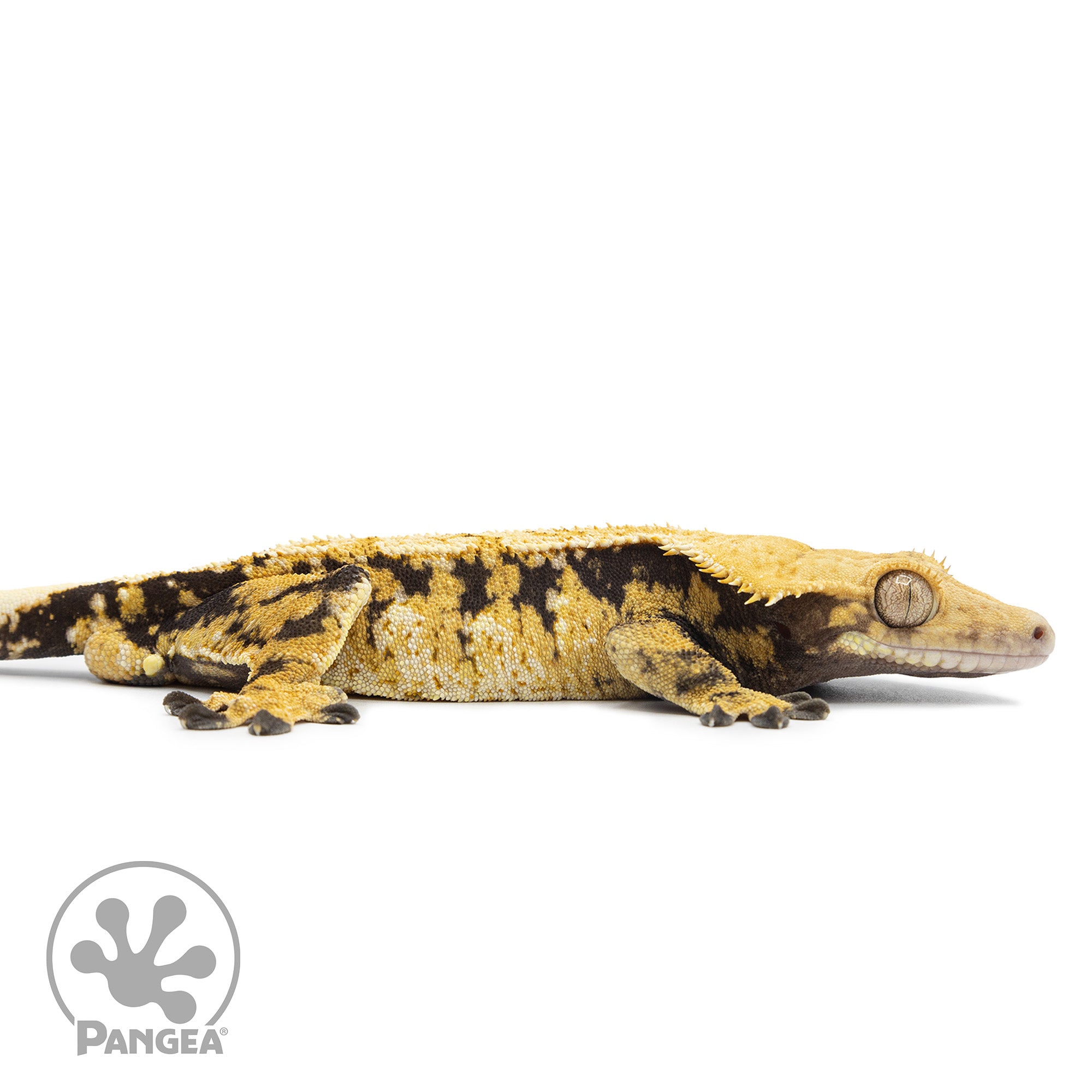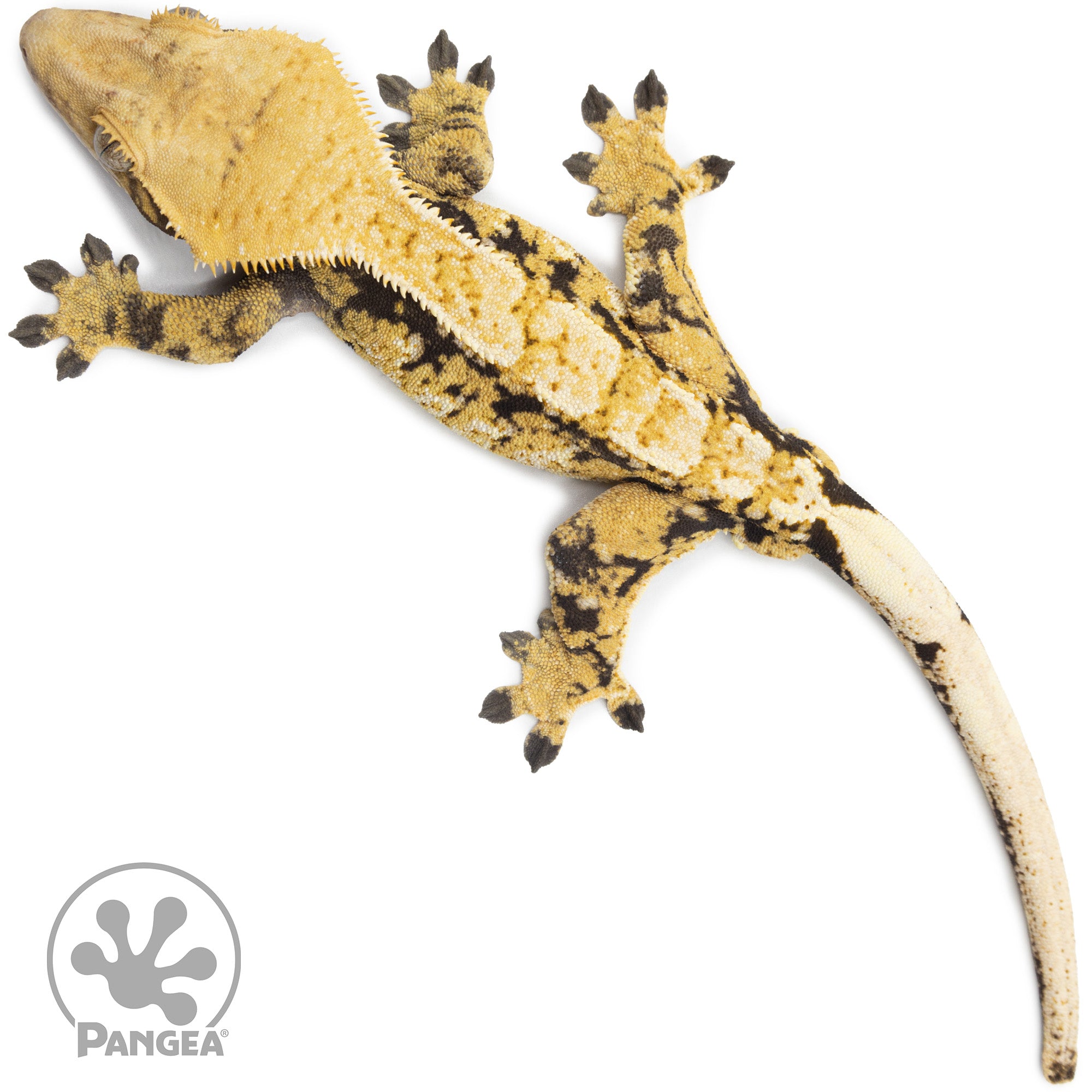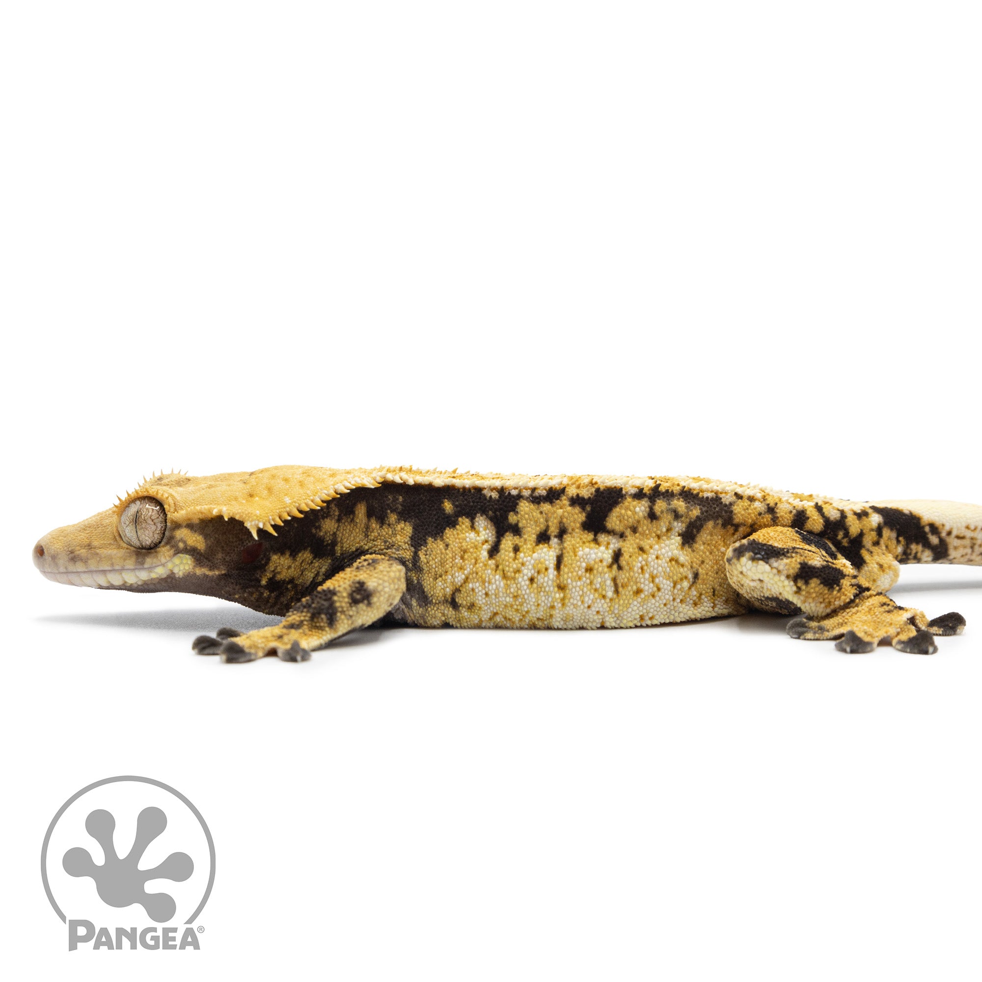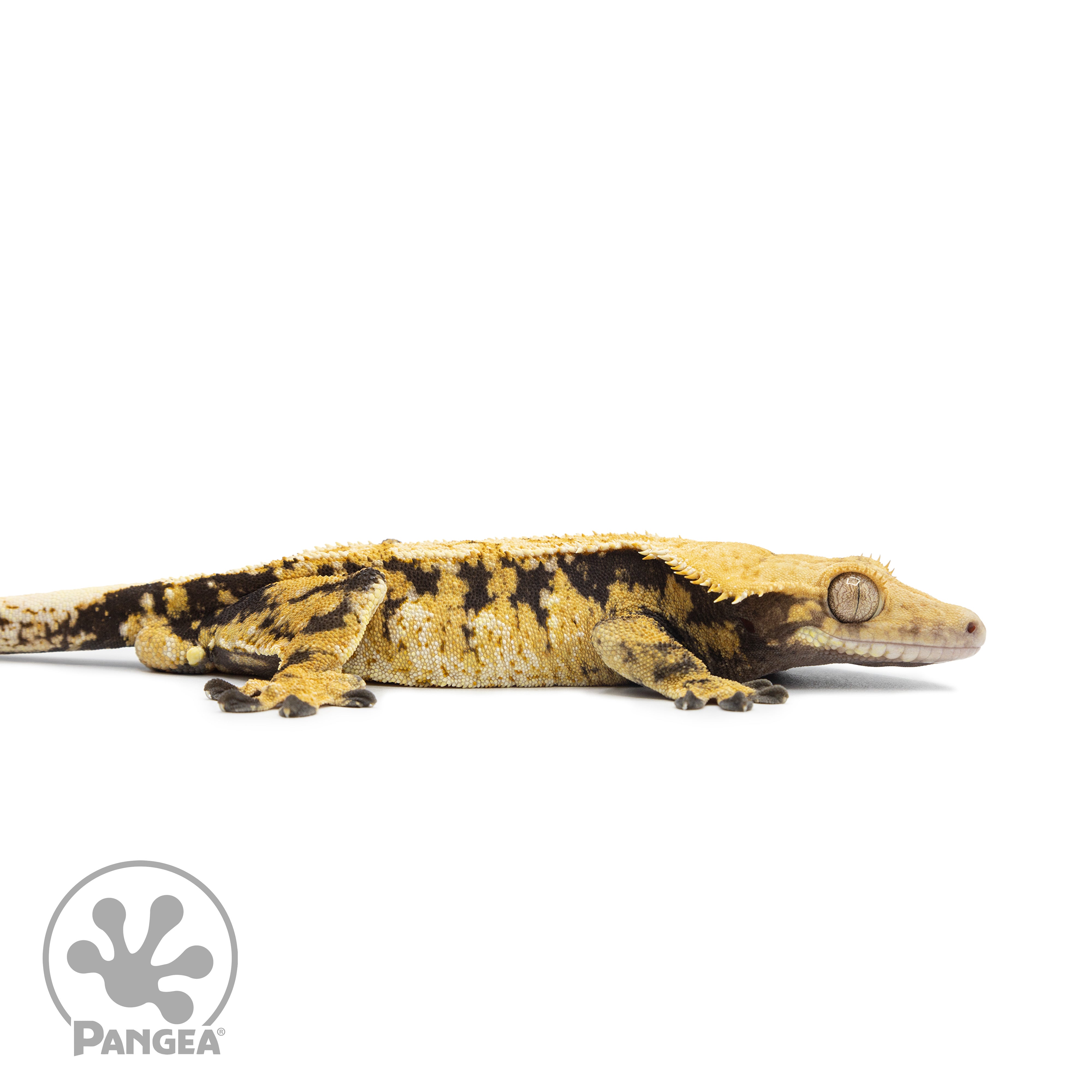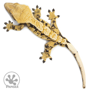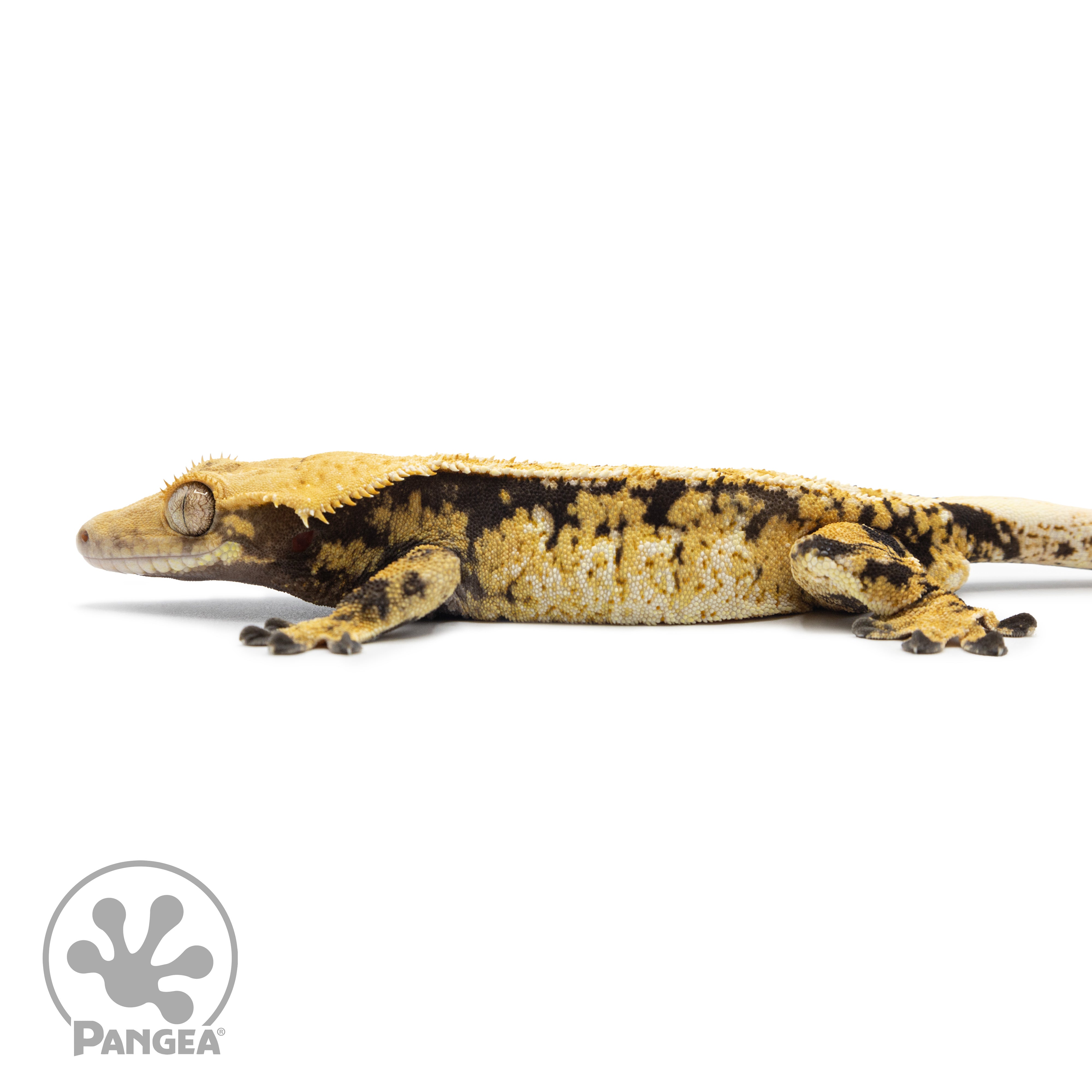 This male Tricolor Extreme Harlequin Crested Gecko (Cr-2550) boasts a striking yellow and white pattern on a dark base. Ready to breed, this gecko is a must-have for any reptile enthusiast looking to add an eye-catching addition to their collection.