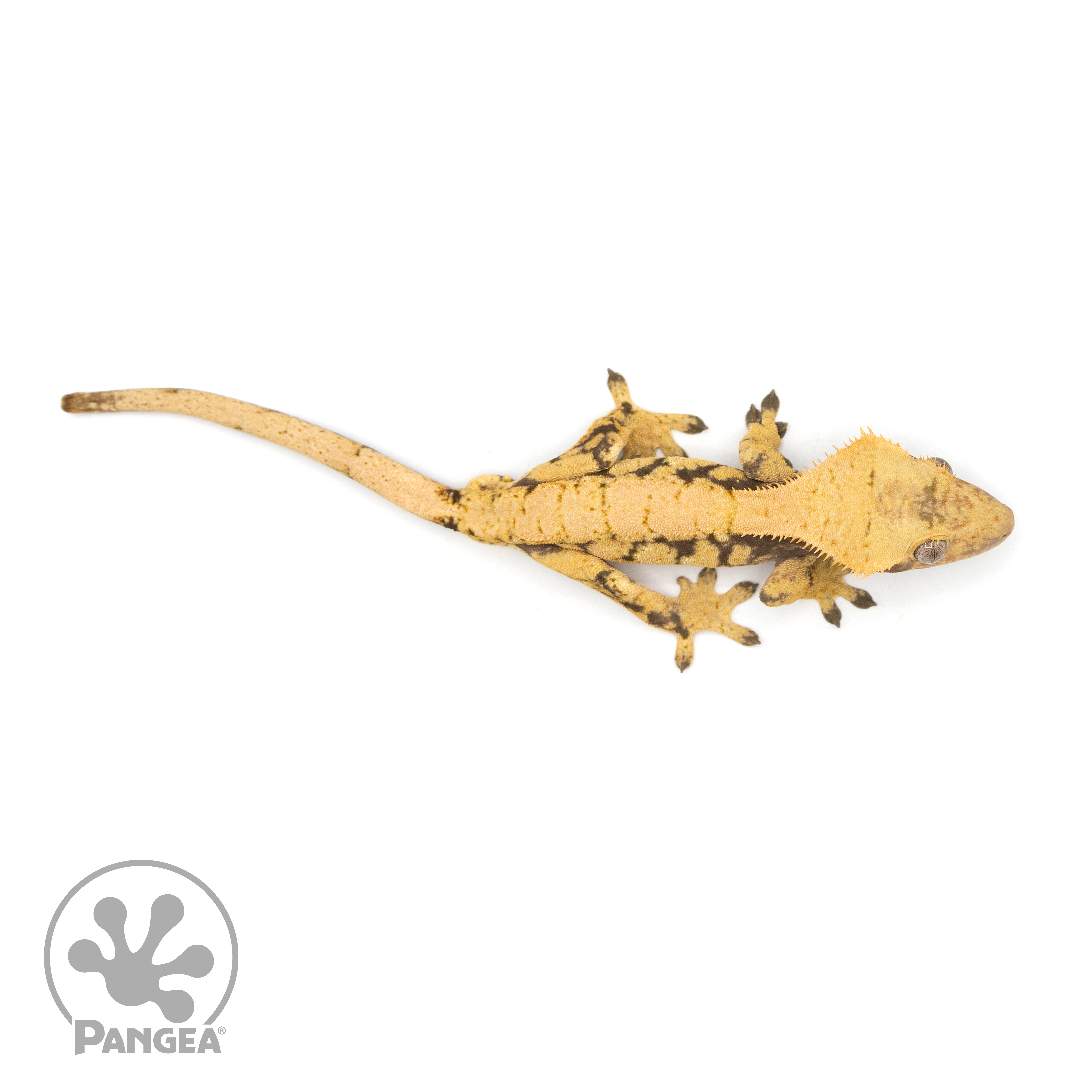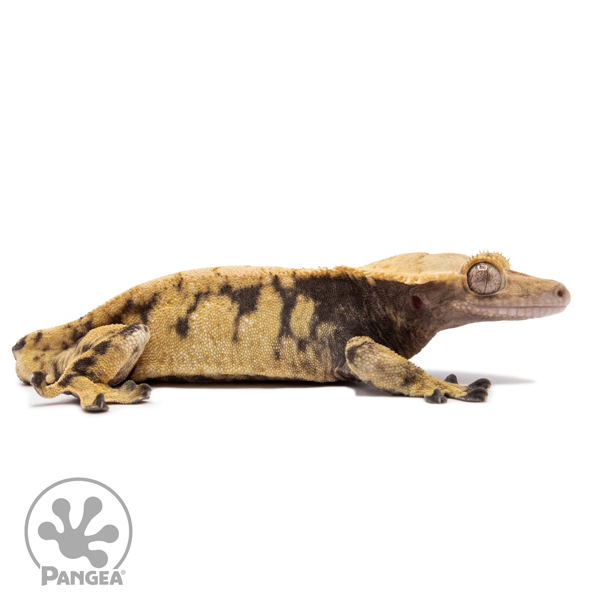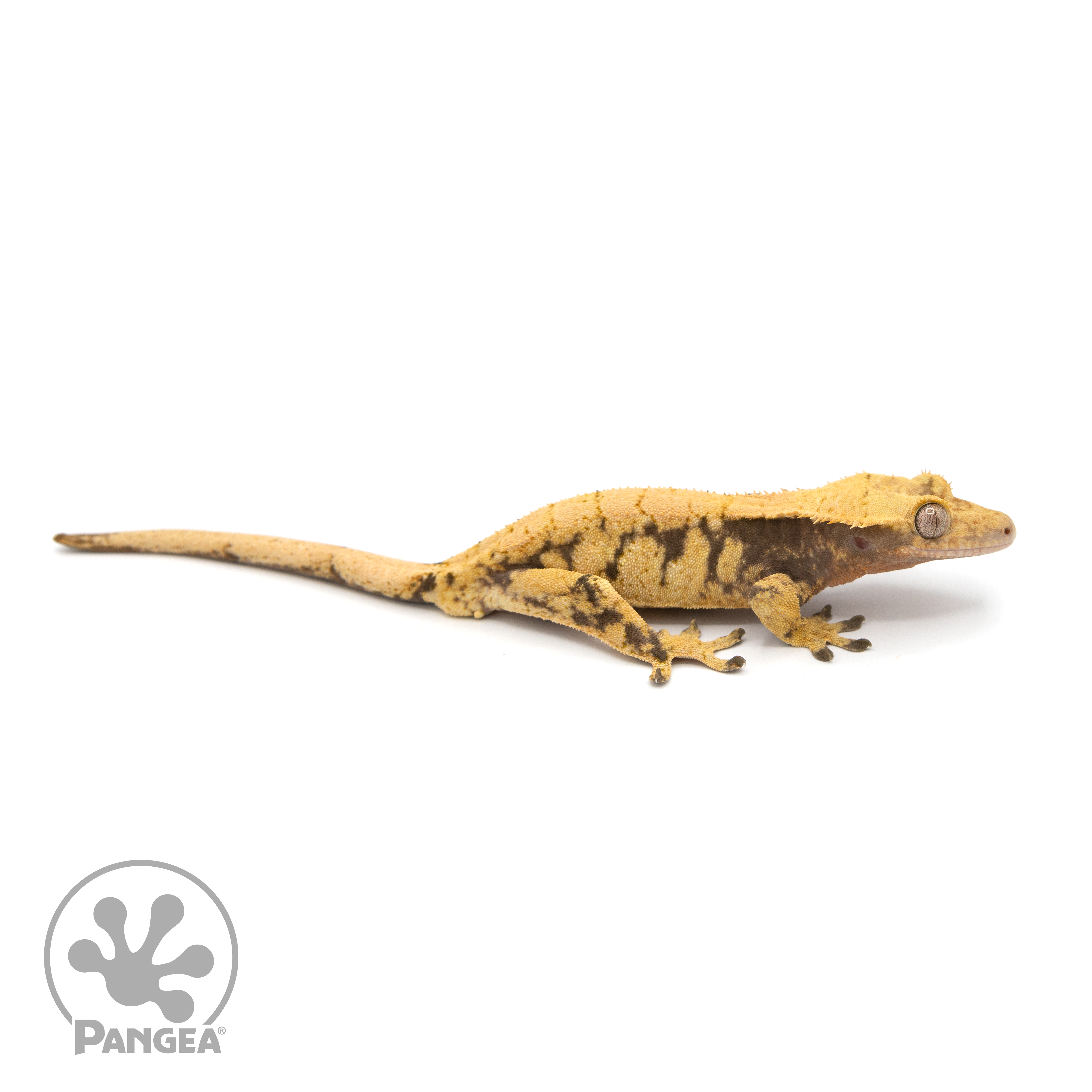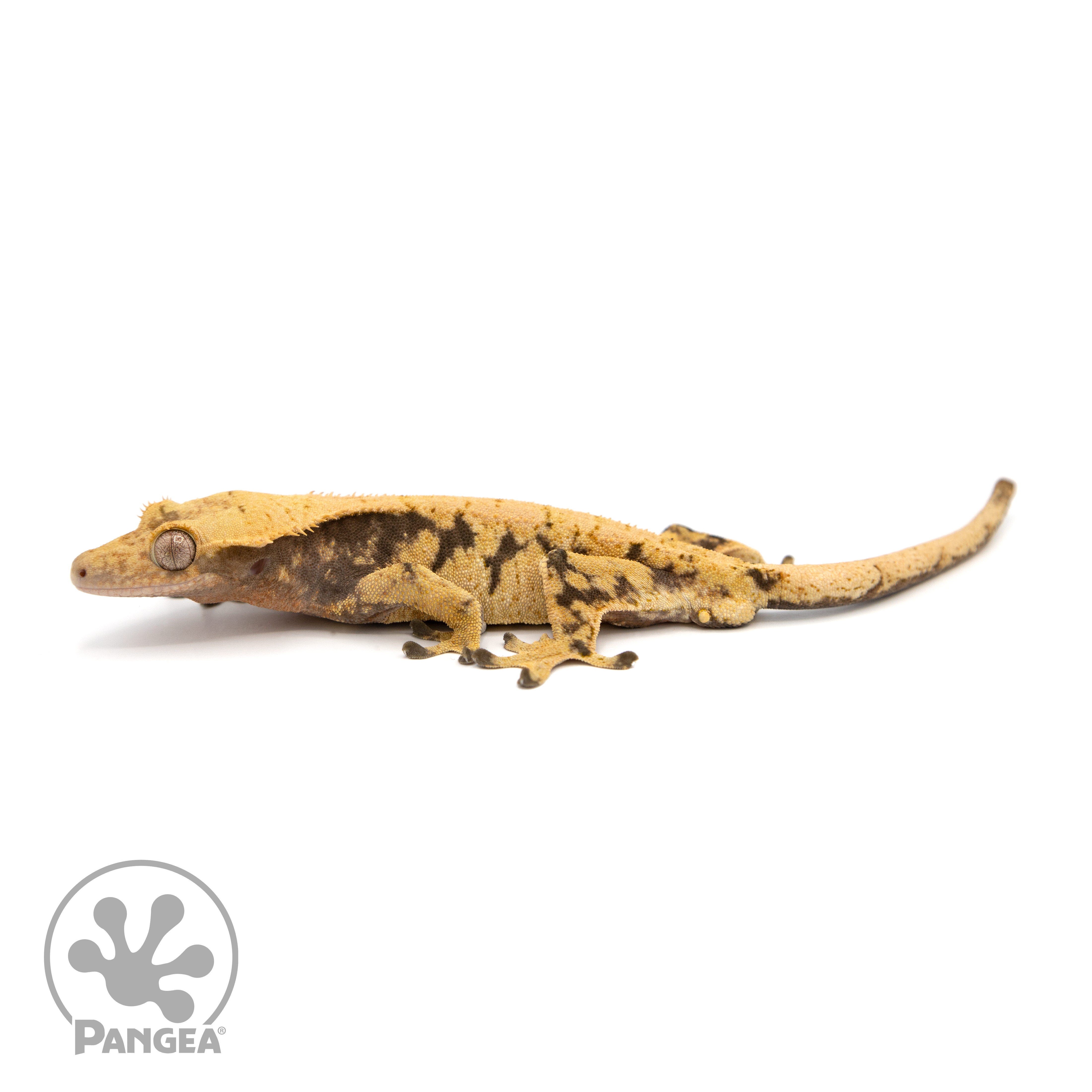 This male XXX Crested Gecko (Cr-1233) has a high coverage extreme XXX pattern in pastel peachy orange on a dark base. He is ready for breeding and is a must-have for any reptile enthusiast!